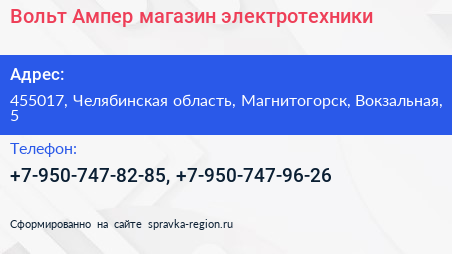 Вольт-Ампер, магазин электротехники по адресу 455017, Челябинская область, Магнитогорск, Вокзальная, 5 в дальнейшем Организация, размещена в следующих категориях: