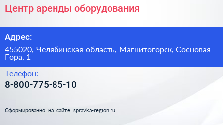 Центр аренды оборудования по адресу 455020, Челябинская область, Магнитогорск, Сосновая Гора, 1 в дальнейшем Организация, размещена в следующих категориях: