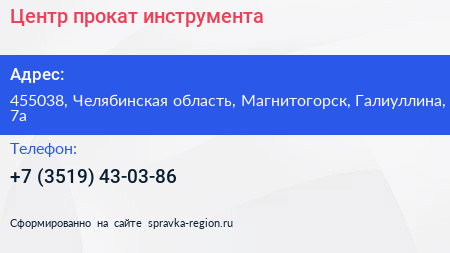 Центр прокат инструмента по адресу 455038, Челябинская область, Магнитогорск, Галиуллина, 7а в дальнейшем Организация, размещена в следующих категориях: