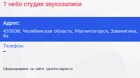 7 небо, студия звукозаписи по адресу 455038, Челябинская область, Магнитогорск, Завенягина, 8а в дальнейшем Организация, размещена в следующих категориях:
