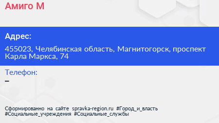 Амиго-М по адресу 455023, Челябинская область, Магнитогорск, проспект Карла Маркса, 74 в дальнейшем Организация, размещена в следующих категориях: