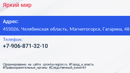 Яркий мир по адресу 455026, Челябинская область, Магнитогорск, Гагарина, 48 в дальнейшем Организация, размещена в следующих категориях: