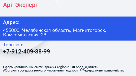 Арт-Эксперт по адресу 455000, Челябинская область, Магнитогорск, Комсомольская, 29 в дальнейшем Организация, размещена в следующих категориях: