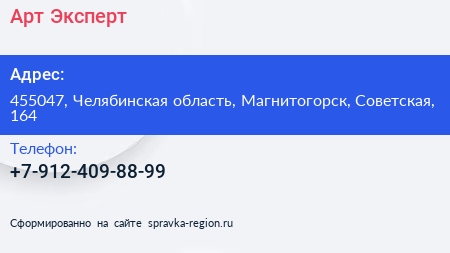 Арт-Эксперт по адресу 455047, Челябинская область, Магнитогорск, Советская, 164 в дальнейшем Организация, размещена в следующих категориях: