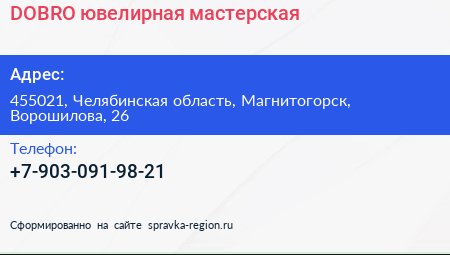 DOBRO, ювелирная мастерская по адресу 455021, Челябинская область, Магнитогорск, Ворошилова, 26 в дальнейшем Организация, размещена в следующих категориях: