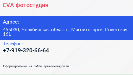EVA, фотостудия по адресу 455030, Челябинская область, Магнитогорск, Советская, 161 в дальнейшем Организация, размещена в следующих категориях: