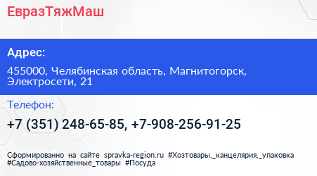 ЕвразТяжМаш по адресу 455000, Челябинская область, Магнитогорск, Электросети, 21 в дальнейшем Организация, размещена в следующих категориях: