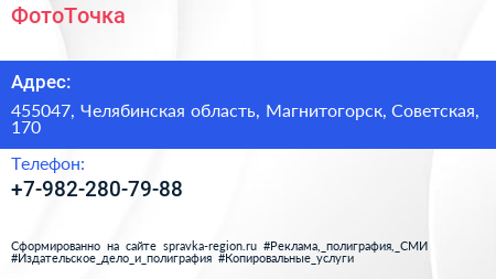 ФотоТочка по адресу 455047, Челябинская область, Магнитогорск, Советская, 170 в дальнейшем Организация, размещена в следующих категориях: