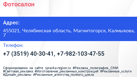Фотосалон по адресу 455021, Челябинская область, Магнитогорск, Калмыкова, 7 в дальнейшем Организация, размещена в следующих категориях: