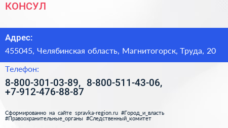 КОНСУЛ по адресу 455045, Челябинская область, Магнитогорск, Труда, 20 в дальнейшем Организация, размещена в следующих категориях:
