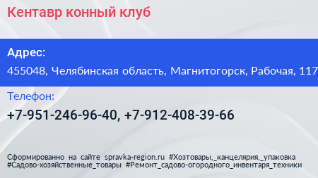 Кентавр, конный клуб по адресу 455048, Челябинская область, Магнитогорск, Рабочая, 117 в дальнейшем Организация, размещена в следующих категориях: