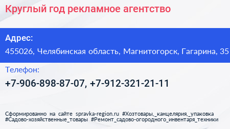 Круглый год, рекламное агентство по адресу 455026, Челябинская область, Магнитогорск, Гагарина, 35 в дальнейшем Организация, размещена в следующих категориях: