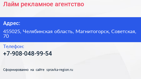 Лайм, рекламное агентство по адресу 455025, Челябинская область, Магнитогорск, Советская, 70 в дальнейшем Организация, размещена в следующих категориях: