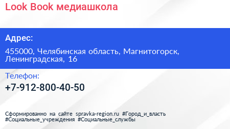 Look Book, медиашкола по адресу 455000, Челябинская область, Магнитогорск, Ленинградская, 16 в дальнейшем Организация, размещена в следующих категориях: