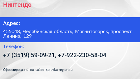 Нинтендо по адресу 455048, Челябинская область, Магнитогорск, проспект Ленина, 129 в дальнейшем Организация, размещена в следующих категориях: