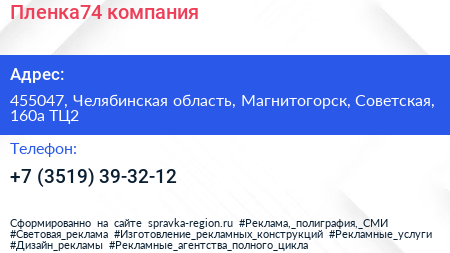 Пленка74, компания по адресу 455047, Челябинская область, Магнитогорск, Советская, 160а ТЦ2 в дальнейшем Организация, размещена в следующих категориях: