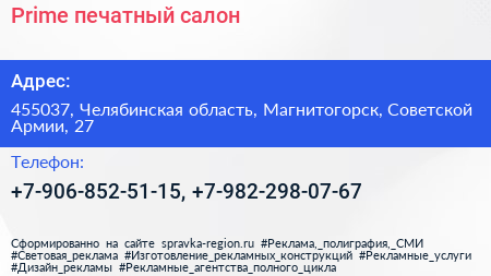 Prime, печатный салон по адресу 455037, Челябинская область, Магнитогорск, Советской Армии, 27 в дальнейшем Организация, размещена в следующих категориях: