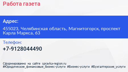 Работа, газета по адресу 455023, Челябинская область, Магнитогорск, проспект Карла Маркса, 63 в дальнейшем Организация, размещена в следующих категориях: