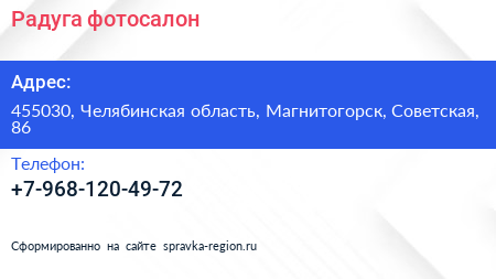 Радуга, фотосалон по адресу 455030, Челябинская область, Магнитогорск, Советская, 86 в дальнейшем Организация, размещена в следующих категориях: