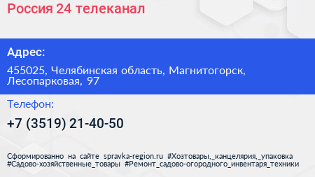 Россия 24, телеканал по адресу 455025, Челябинская область, Магнитогорск, Лесопарковая, 97 в дальнейшем Организация, размещена в следующих категориях: