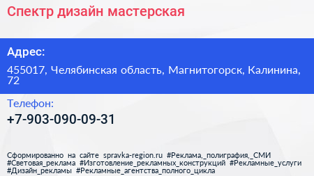 Спектр, дизайн-мастерская по адресу 455017, Челябинская область, Магнитогорск, Калинина, 72 в дальнейшем Организация, размещена в следующих категориях: