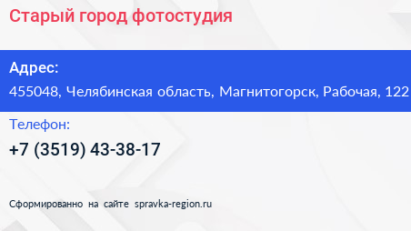 Старый город, фотостудия по адресу 455048, Челябинская область, Магнитогорск, Рабочая, 122 в дальнейшем Организация, размещена в следующих категориях:
