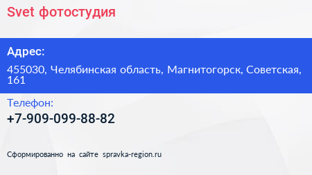 Svet, фотостудия по адресу 455030, Челябинская область, Магнитогорск, Советская, 161 в дальнейшем Организация, размещена в следующих категориях:
