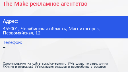 The Make, рекламное агентство по адресу 455001, Челябинская область, Магнитогорск, Первомайская, 12 в дальнейшем Организация, размещена в следующих категориях: