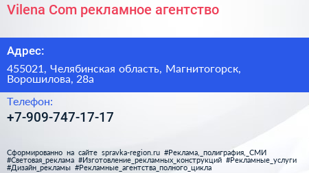 Vilena-Com, рекламное агентство по адресу 455021, Челябинская область, Магнитогорск, Ворошилова, 28а в дальнейшем Организация, размещена в следующих категориях: