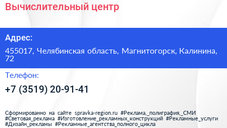 Вычислительный центр по адресу 455017, Челябинская область, Магнитогорск, Калинина, 72 в дальнейшем Организация, размещена в следующих категориях: