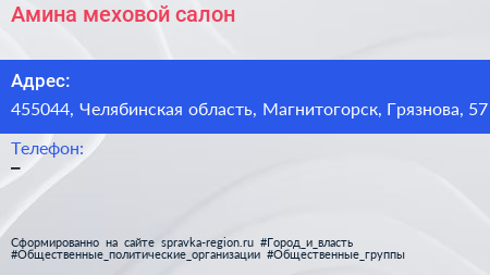 Амина, меховой салон по адресу 455044, Челябинская область, Магнитогорск, Грязнова, 57 в дальнейшем Организация, размещена в следующих категориях: