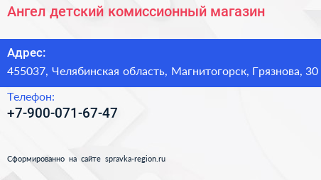 Ангел, детский комиссионный магазин по адресу 455037, Челябинская область, Магнитогорск, Грязнова, 30 в дальнейшем Организация, размещена в следующих категориях: