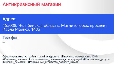 Антикризисный магазин по адресу 455038, Челябинская область, Магнитогорск, проспект Карла Маркса, 149а в дальнейшем Организация, размещена в следующих категориях: