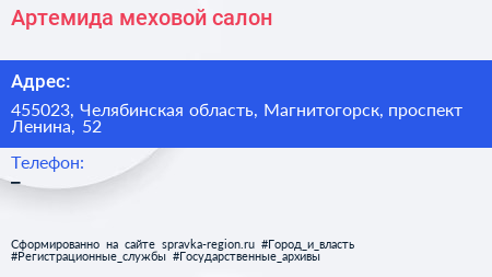 Артемида, меховой салон по адресу 455023, Челябинская область, Магнитогорск, проспект Ленина, 52 в дальнейшем Организация, размещена в следующих категориях: