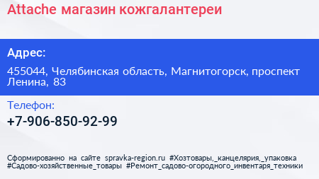 Attache, магазин кожгалантереи по адресу 455044, Челябинская область, Магнитогорск, проспект Ленина, 83 в дальнейшем Организация, размещена в следующих категориях: