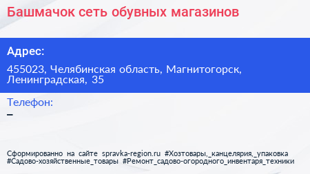 Башмачок, сеть обувных магазинов по адресу 455023, Челябинская область, Магнитогорск, Ленинградская, 35 в дальнейшем Организация, размещена в следующих категориях: