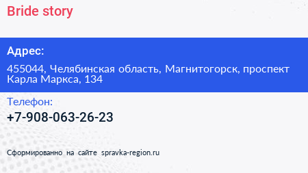 Bride story по адресу 455044, Челябинская область, Магнитогорск, проспект Карла Маркса, 134 в дальнейшем Организация, размещена в следующих категориях:
