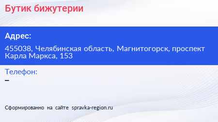 Бутик бижутерии по адресу 455038, Челябинская область, Магнитогорск, проспект Карла Маркса, 153 в дальнейшем Организация, размещена в следующих категориях: