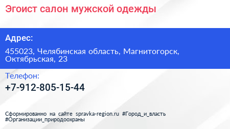 Эгоист, салон мужской одежды по адресу 455023, Челябинская область, Магнитогорск, Октябрьская, 23 в дальнейшем Организация, размещена в следующих категориях: