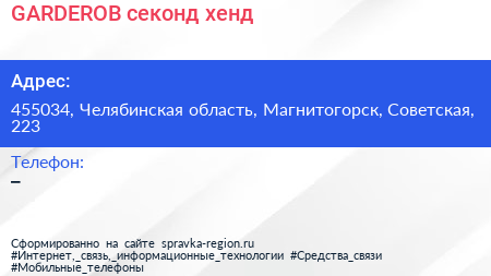 GARDEROB, секонд-хенд по адресу 455034, Челябинская область, Магнитогорск, Советская, 223 в дальнейшем Организация, размещена в следующих категориях: