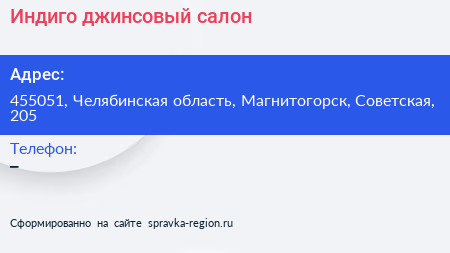Индиго, джинсовый салон по адресу 455051, Челябинская область, Магнитогорск, Советская, 205 в дальнейшем Организация, размещена в следующих категориях: