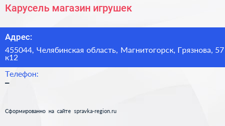 Карусель, магазин игрушек по адресу 455044, Челябинская область, Магнитогорск, Грязнова, 57 к12 в дальнейшем Организация, размещена в следующих категориях: