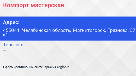 Комфорт, мастерская по адресу 455044, Челябинская область, Магнитогорск, Грязнова, 57 к1 в дальнейшем Организация, размещена в следующих категориях: