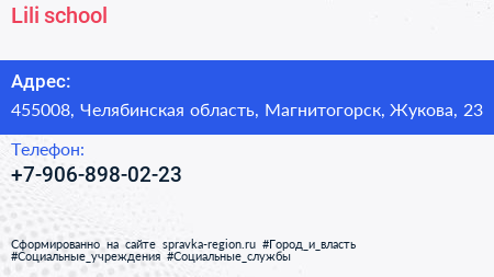 Lili school по адресу 455008, Челябинская область, Магнитогорск, Жукова, 23 в дальнейшем Организация, размещена в следующих категориях: