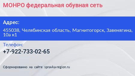 МОНРО, федеральная обувная сеть по адресу 455038, Челябинская область, Магнитогорск, Завенягина, 10а к1 в дальнейшем Организация, размещена в следующих категориях: