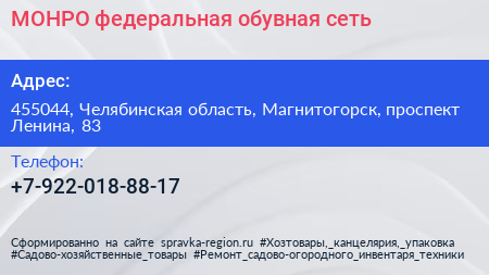 МОНРО, федеральная обувная сеть по адресу 455044, Челябинская область, Магнитогорск, проспект Ленина, 83 в дальнейшем Организация, размещена в следующих категориях: