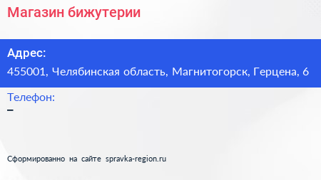Магазин бижутерии по адресу 455001, Челябинская область, Магнитогорск, Герцена, 6 в дальнейшем Организация, размещена в следующих категориях: