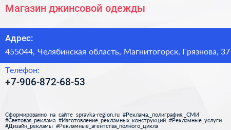 Магазин джинсовой одежды по адресу 455044, Челябинская область, Магнитогорск, Грязнова, 37 в дальнейшем Организация, размещена в следующих категориях: