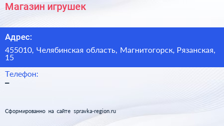 Магазин игрушек по адресу 455010, Челябинская область, Магнитогорск, Рязанская, 15 в дальнейшем Организация, размещена в следующих категориях: