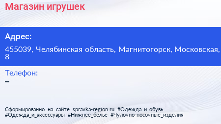 Магазин игрушек по адресу 455039, Челябинская область, Магнитогорск, Московская, 8 в дальнейшем Организация, размещена в следующих категориях: